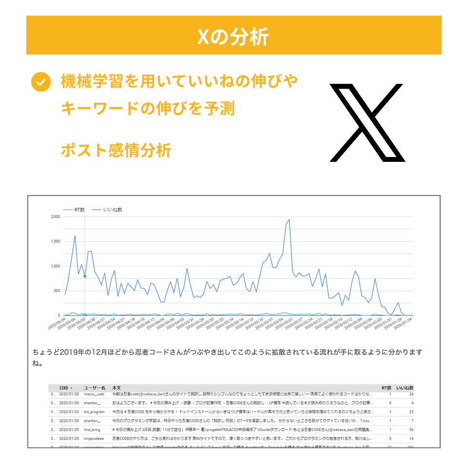 • Xの分析 機械学習を用いていいねの伸びやキーワードの伸びを予測