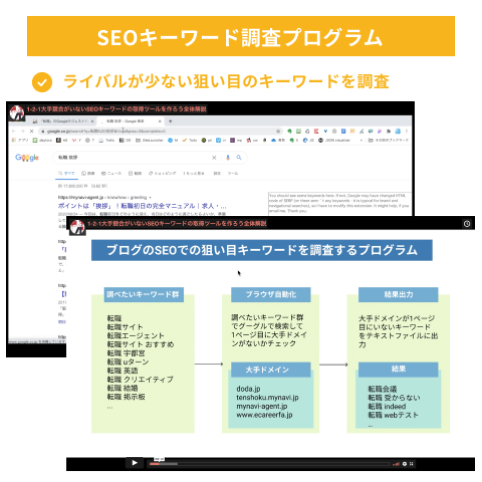 「Pandas」や、ブラウザを操作する「selenium」といった開発の役に立つプログラムを扱います。