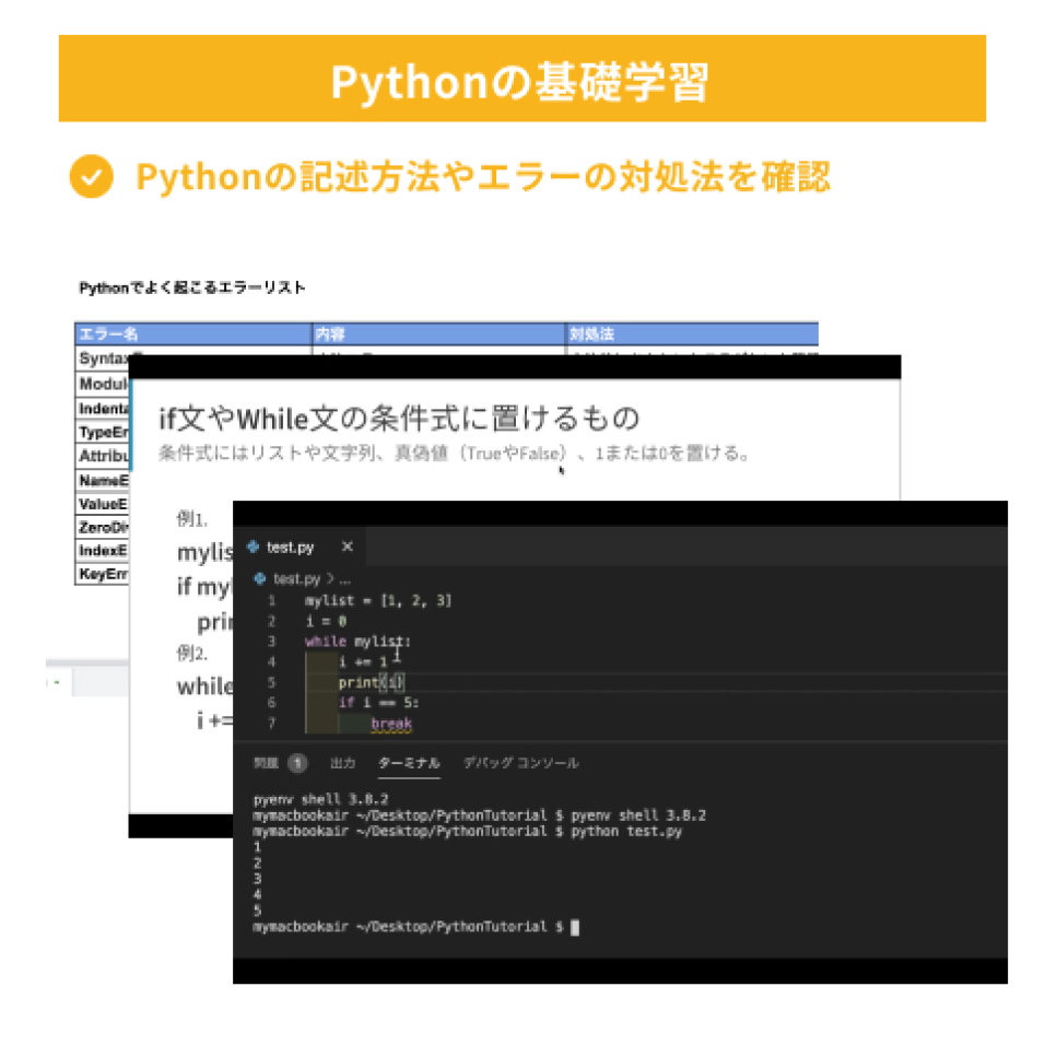 Python基本的な文法や、Pythonの各種ライブラリを学習します。