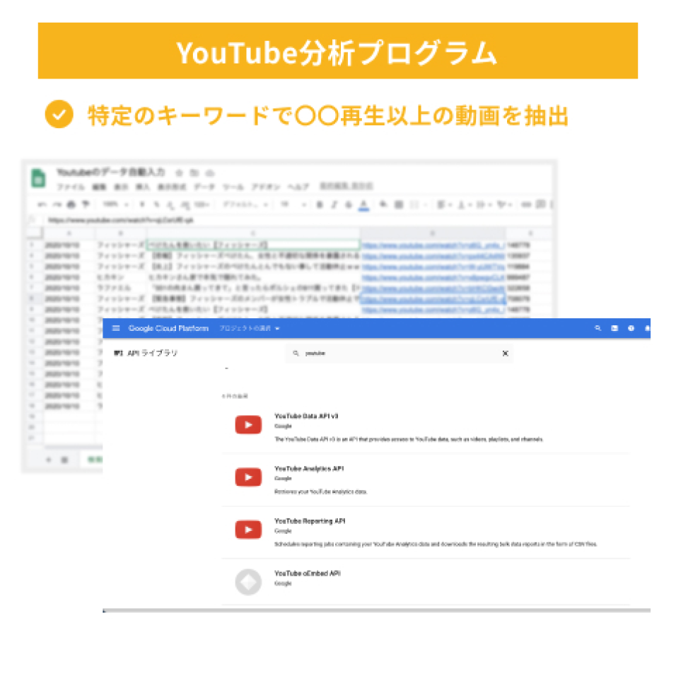 • 各種分析アプリの開発 Instagramアカウント情報やハッシュタグ情報の解析アプリ YouTubeキーワードや関連動画検索アプリ