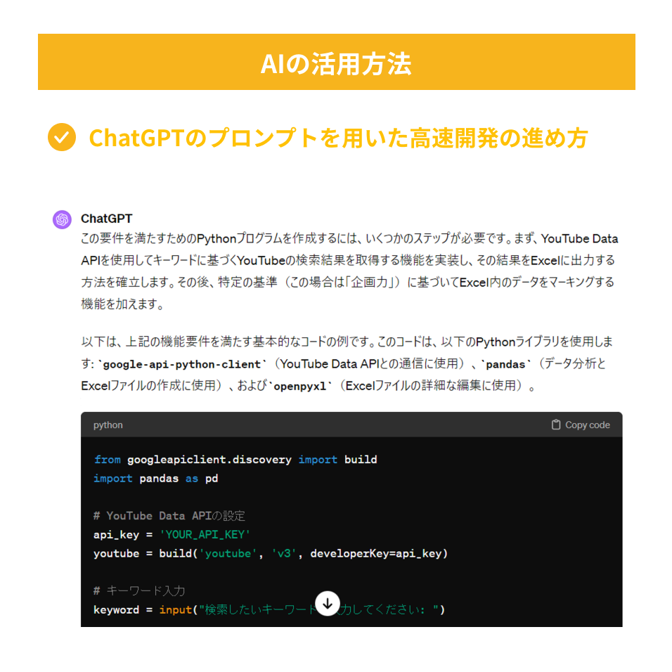 ただPythonを学習するだけでなく、実際に使えるツールを開発するからこそ楽しく学習を進行できます。YouTubeから特定条件を満たす動画を抽出するツールや株価予測のシミュレーションツール、Instagramのフォロワー・キーワード分析など、私達の身近でありビジネスに関する情報を取得・分析する開発をおこないます!また、Excel分析の解説も近日公開予定です!