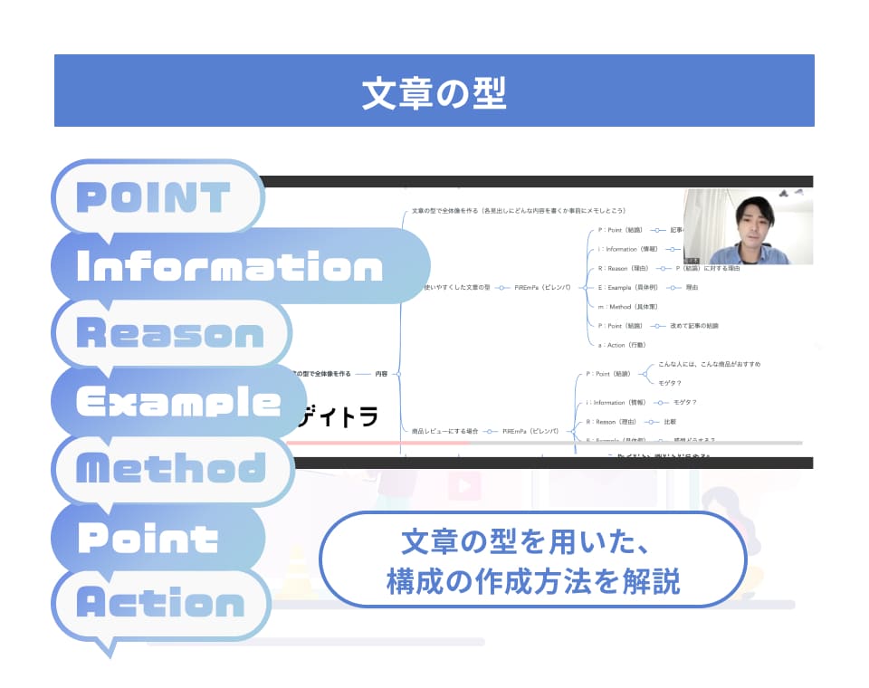 業界や学習法についての基本を押さえたら、いよいよ文章理論を学んでいきます。「企画→構成→リサーチ→執筆→推敲」の記事作成の一連の流れや、「リード文」「まとめ文」といったパート分けした文章の書き方を学習していきます。