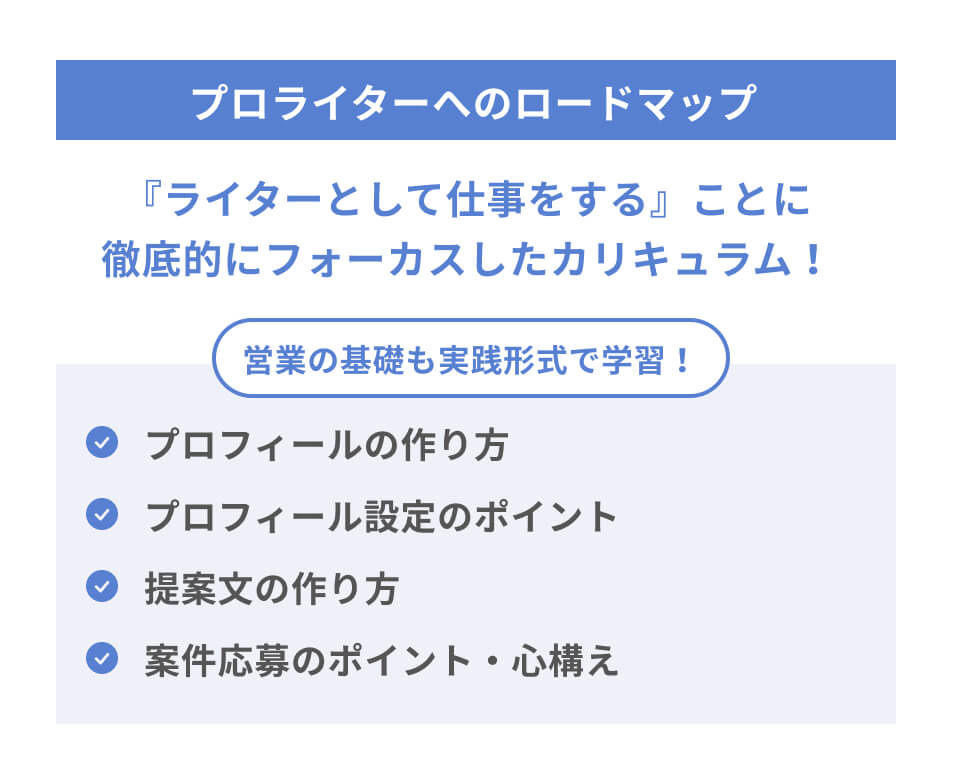 本カリキュラムではライティングスキルを超実践的スタイルで習得し、ビジネス視点で市場から求められるライターを目指します!
