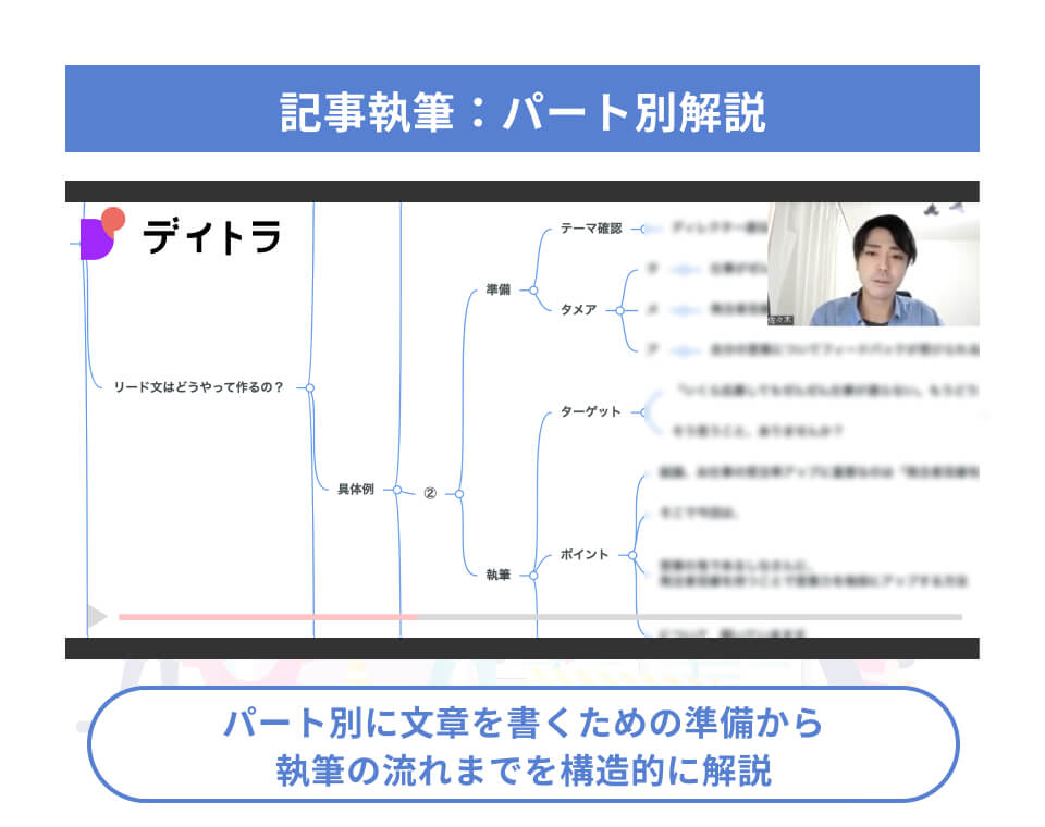 文章力を武器に様々な仕事が受けられるようになるため、デイトラでは取材やLPライティングについても徹底的に解説しています! -