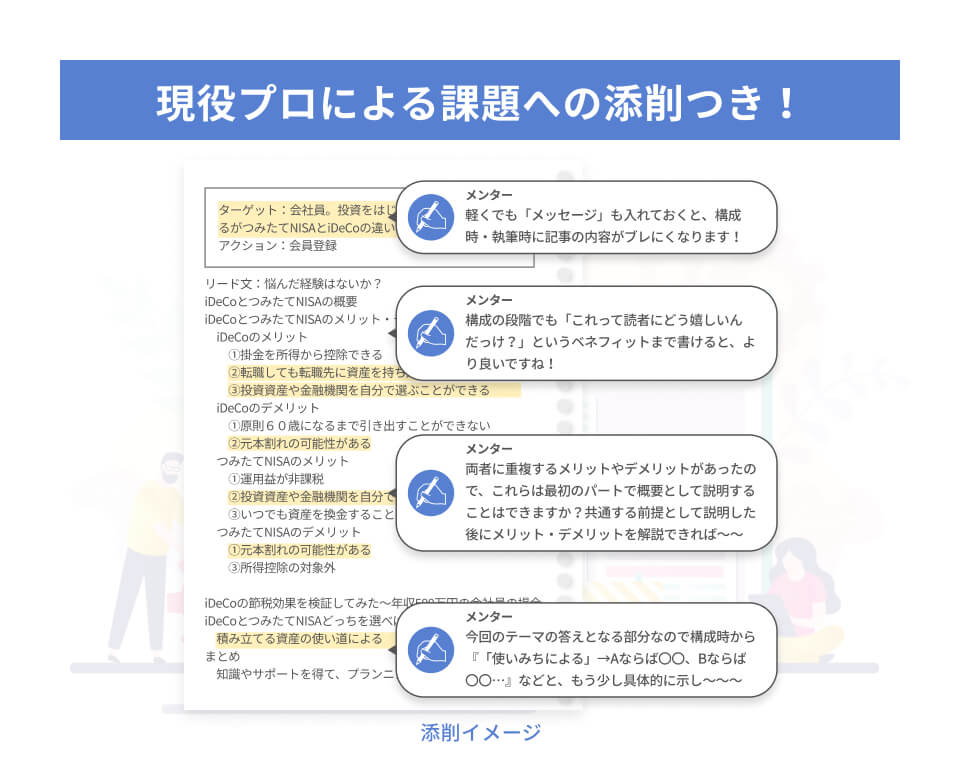 文章は闇雲に書いていても上達しません。アウトプットに対して丁寧にフィードバックをお返ししますので、着実なスキルアップへ繋がります。ライティングコースのメンター一覧添削イメージ